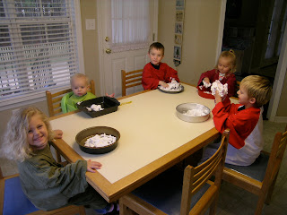 Here's the class playing in shaving cream snow. Notice how much Sam and John have on their hands? The girls weren't so keen on getting their hands messy.